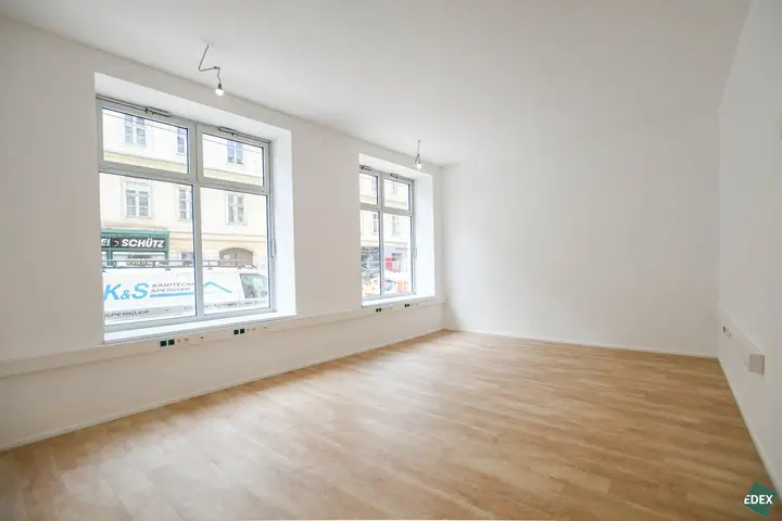 Die Fläche befindet sich im Erdgeschoss eines repräsentativen Gebäudes und ist sowohl über die Straße als auch über das Stiegenhaus erreichbar. Große Fensterflächen sorgen für viel Tageslicht und gute Sichtbarkeit und schaffen eine helle und angenehme Arbeitsatmosphäre.