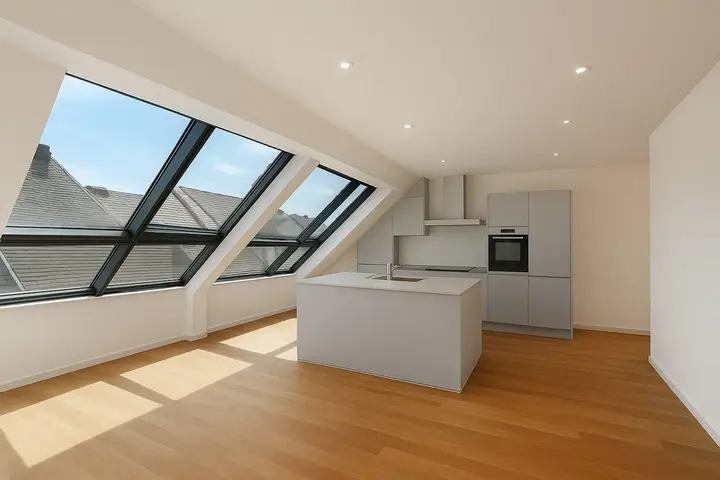 Im oberen Dachgeschoß eröffnet sich der großzügige Wohnsalon – ein beeindruckender, offener Lebensraum mit traumhaftem Fernblick über die Dächer Wiens. Die südwestlich ausgerichtete Sonnenterrasse mit Blick in den ruhigen Innenhof ist direkt vom Wohnbereich aus zugänglich und lädt zum Entspannen im Freien ein.