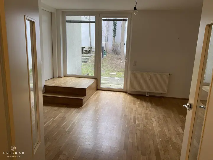 Die Wohnung ist wie folgt aufgeteilt: Küche mit weißen Fronten, Kühlschrank mit Tiefkühlfach, Mikrowelle, Herd, Backrohr, Geschirrspüler, 1 Schlafzimmer, Bad mit Wanne, WC mit Handwaschbecken, Abstellraum mit Waschmaschinenanschluss, Vorraum. Vom Wohnzimmer gelangt man auf die Terrasse mit kleiner Gartenfläche in den begrünten Innenhof.