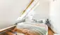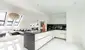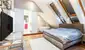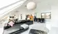 Von hier aus öffnet sich der weitläufige Wohn- und Essbereich, der durch offene Strukturen, großzügige Fensterflächen und markante Dachschrägen das stilistische Zentrum der Wohnung bildet. Die angrenzende Küche orientiert sich in Richtung eines ruhigen, begrünten Innenhofs und verbindet Funktionalität mit einer angenehmen, einladenden Atmosphäre.