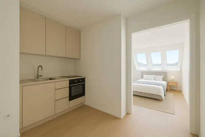 Auf ca. 35,44 m² Wohnfläche entfaltet sich ein durchdachter Grundriss, der sowohl Funktionalität als auch Gemütlichkeit vereint. Der Erstbezug garantiert Ihnen eine frische, neu gestaltete Umgebung, die nur darauf wartet, von Ihnen persönlich gestaltet zu werden. Der beeindruckende Stadtblick lässt Sie die pulsierende Energie Wiens direkt von Ihrem eigenen Wohnzimmer aus erleben. Die Wohnung ist mit hochwertigen Materialien ausgestattet, darunter stilvolle Fliesen und warmes Parkett, die für ein angenehmes Wohnklima sorgen. Die Fußbodenheizung sorgt für wohlige Wärme, während die Klimaanlage auch an heißen Sommertagen für erfrischende Kühle sorgt. Eine moderne Dusche rundet das Badezimmer ab und verleiht der Wohnung einen zeitgemäßen Touch. Klarstellend wird festgehalten, dass die endgültige Ausführung von der Visualisierung abweichen kann und aus der Visualisierung keine Rechtsansprüche abgeleitet werden können.