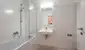 • Bad mit Badewanne, Duschglas, Waschbecken und Handtuchtrockner