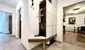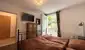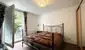 Links vom Eingangsbereich erreichen Sie das separate WC, das komfortable Badezimmer mit Fenster und Dusche sowie das Schlafzimmer, das über eine elegante Glastür ebenfalls Zugang in den Garten bietet.