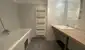 • Badezimmer mit Wanne, Waschbecken und Waschmaschinenanschluss