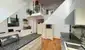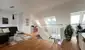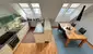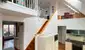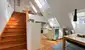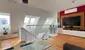 Über eine zentrale Stiege öffnet sich der Wohnraum in die obere Galerieebene. Hier befinden sich das nach West und Ost offene Wohnzimmer mit Zugang zur Dachterrasse und einer Büro-Ecke.