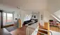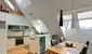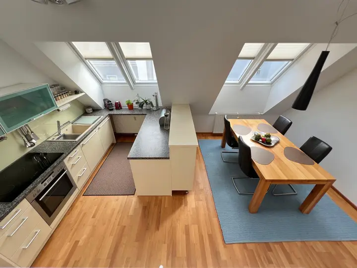 Der offene Wohn/Essbereich mit hellem Parkettboden ist durch die großen Dachfenster sehr hell und bietet ausreichend Platz für einen Essbereich und die offene Küchenlandschaft. Diese ist mit modernen Geräten ausgestattet und bietet viel Arbeitsfläche und Stauraum. Zusammen ergibt sich ein perfekter Raum um mit den Liebsten schöne Stunden zu verbringen und das Leben zu genießen.
