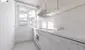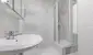 Funktional und knapp gehalten – um den Lebens- und Aufenthaltsbereichen den Raumanteil zuweisen zu können, den sie verdienen – zeigt sich das Badezimmer, dass durch weiße Mosaikfliesen an Wänden und Böden optisch an Größe gewinnt. Ausgestattet mit Waschbecken und Dusche bleibt hier auch noch genug Platz für eine Waschmaschine (der Anschluss erfolgt über die Zu- und Ableitungen des Waschbeckens).