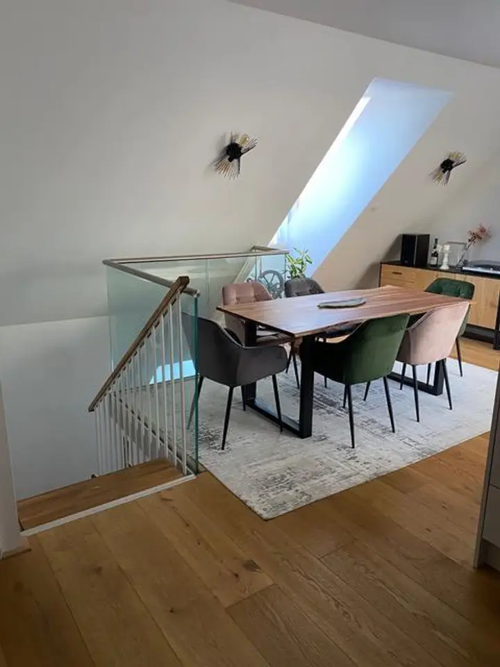 Die Wohnung Tür 3 besteht im 1. Stock aus einem zentralen Vorzimmer, einem Abstellraum, einem WC extra, einem großen gartenseitigen Zimmer, einem weiteren großen Zimmer mit über 4 Meter Raumhöhe, einem Badezimmer mit Waschtisch, Badewanne und Dusche, einem 21 m² Wohnzimmer mit Aufgang zum Dachgeschoß/Galerie mit einer 25 m² Wohnküche mit Essbereich, einer großen Speisekammer, sowie einer davor liegenden 16 m² großen Terrasse.