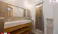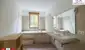 Die Bäder sind in sanften, natürlichen Tönen gehalten Sand, Taupe, Elfenbein. Feine Fliesen, edle Armaturen, großzügige Spiegelflächen und viel Licht schaffen eine Atmosphäre, die an ein Boutique-Hotel erinnert. Das große Familienbad im Obergeschoss mit Wanne und Doppelwaschtisch vermittelt Weite und Ruhe; das zweite Bad im Dachgeschoss mit bodengleicher Dusche wirkt modern, klar und elegant.