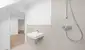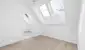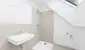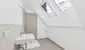 Das etwa 5 m² große Tageslicht-Badezimmer verfügt über eine Dusche, ein Handwaschbecken, einen Waschmaschinen - Anschluss und einer Toilette. Dank der beiden großen Dachschrägen Fenster ist ein frisches Badezimmer-Klima immer garantiert.