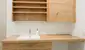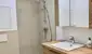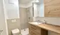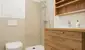 Das moderne Badezimmer ist über das Wohnzimmer zu begehen und ist mit einer Dusche, einem Handwaschbecken, einer Toilette und einem Waschmaschinen-Anschluss ausgestattet. Das maßgeschneiderte Badezimmer vom Tischler bietet mit einem eleganten Verbau inklusive Spiegelschrank und Spiegelleuchte jede Menge Stauraum. Eine hochwertige Glasduschwand rundet das stilvolle Ambiente ab.