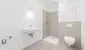 Neben dem Eingangsbereich liegt das moderne Badezimmer mit fast 5 m² Größe, welches mit einer Duschkabine, einem Handwaschbecken, einer Toilette und einem Waschmaschinen-Anschluss ausgestattet ist.