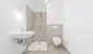 Das moderne Badezimmer ist über das Wohnzimmer zu begehen und ist mit einer Dusche, einem Handwaschbecken, einer Toilette und einem Waschmaschinen-Anschluss ausgestattet.