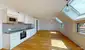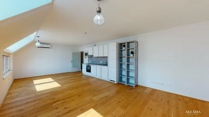 Beim Betreten der Wohnung befindet man sich im Vorzimmer, von welchem aus man die Möglichkeit hat, alle Zimmer zentral zu begehen. Die Wohnung ist sehr gut belichtet und verfügt über ein großes Wohnzimmer inklusive Wohnküche. Bei Bedarf ist der Raum ideal trennbar und es kann somit ein weiteres Zimmer mit wenig Aufwand geschaffen werden. Wohn- und Schlafzimmer sind durch breite Fenster geprägt, welche einen schönen Blick über den 16. Bezirk ermöglichen. Das offene und helle Ambiente runden das harmonische Konzept ab und machen die Wohnung zu einer Wohlfühloase über den Dächern Wiens.