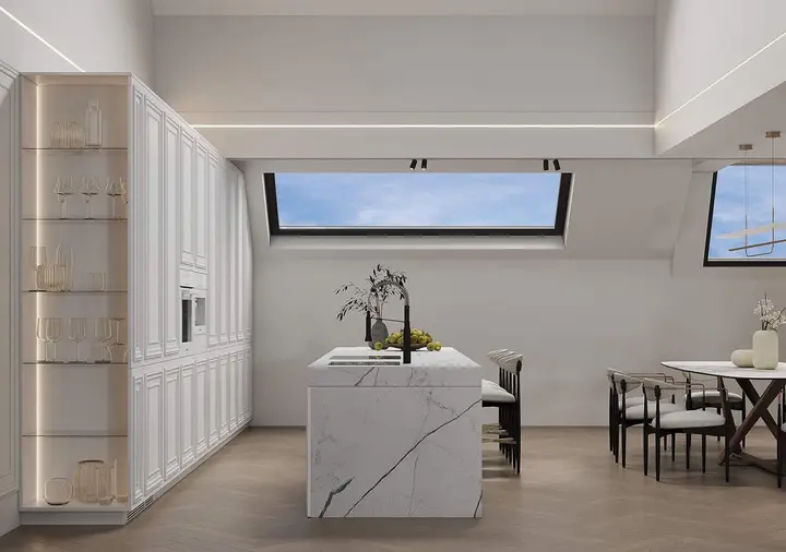 Die Wohnung verfolgt eine moderne Grundrissgestaltung. So gelangen Sie zunächst über ein ca. 11m² großes Entree in den offenen Wohnbereich, der mit rund 48m² ausreichend Platz für eine großzügig geplante Küche mit Kücheninsel bietet. Dieses Herzstück der Wohnung ermöglicht gesellige Zusammenkünfte mit Freunden oder ein gemütliches Beisammensitzen mit der Familie. Das große, bodentiefe Fenster bietet Zugang zur Terrasse auf Wohnebene, von wo aus eine Treppe auf die Dachterrasse führt. Diese Dachterrasse mit insgesamt ca. 51m² garantiert Weitblicke über die Stadt und verspricht Ihnen entspannte Sonnenstunden. Diese Fläche bietet genügend Platz, um sich gestalterisch auszuleben.