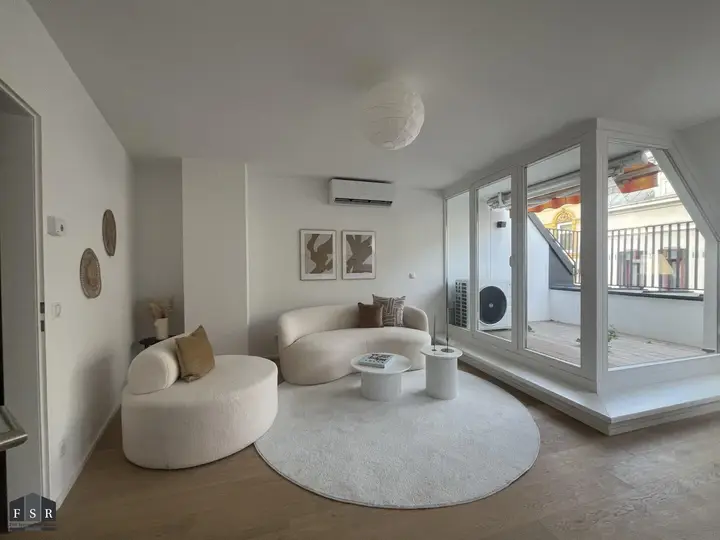 Die Wohnung liegt im Dachgeschoß eines Mehrfamilienhauses mit glatter Fassade und Personenaufzug. Sie verfügt über drei Zimmer allesamt mit idealer Größe. Die Wohnküche ist geräumig und hell, über sie gelangt man auf die prachtvolle Terrassenfläche. Im Abstellraum befindet sich der Waschmaschinenanschluss. Die beiden Schlafzimmer befinden sich in der 2.Etage der Maisonettewohnung. Hier ist auch das Badezimmer mit Badewanne und WC gelegen. Die großen Fenster und die Terrasse, welche nach Osten gerichtet sind machen die Wohnung hell und freundlich. Der neu verlegte Parkettboden lässt die Wohnung hochwertig wirken. Das Badezimmer und WC wurden stylisch renoviert und verfügen über neue Armaturen.