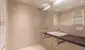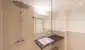 // Badezimmer mit Feinsteinzeug, eingebautem Waschtisch, Spiegel, Walk-In Dusche und Handtuchradiator, Sanitär von Laufen