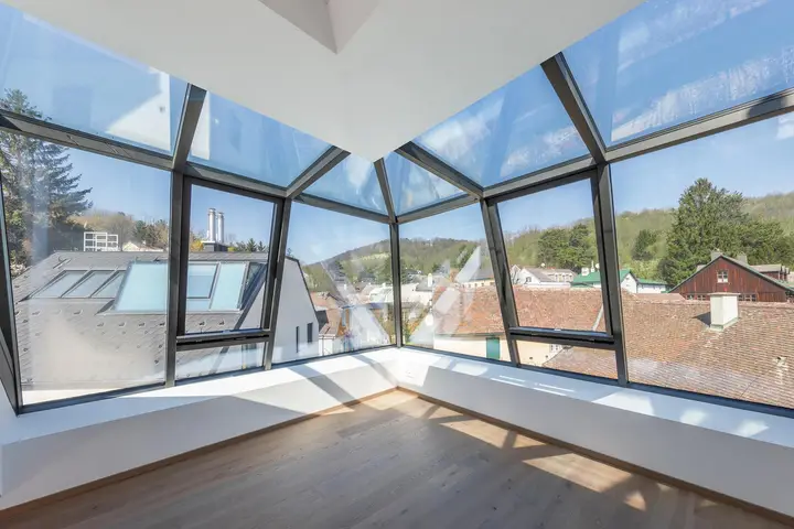 Der 360 Grad Rundumblick der Dachterrasse (27,30 m²) ist das Highlight dieser Wohnung. Die rund 117 m² Wohnfläche teilen sich auf zwei Etagen auf. Im Obergeschoß befindet sich der Wohn- Essbereich sowie die Küche und eine der Terrassen (6,58 m²) wieder. Durch die markante Glasfront aus Isolierverglasung wird der Raum von natürlichem Licht geflutet und bleibt trotzdem angenehm kühl. Im Untergeschoß befinden sich die drei Schlafzimmer sowie das großzügige Badezimmer. In den Wohnräumen wurden Landhausdielen in Eiche der Marke Scheucher verlegt. Die Feuchträume wurden mit hochwertigem Feinsteinzeug ausgekleidet sowie mit Keramik der Linie Laufen Pro ausgestattet. Stauraum bietet ihnen neben einem eigenen Kellerabteil auch ein Abstellraum in der Wohnung.
