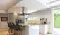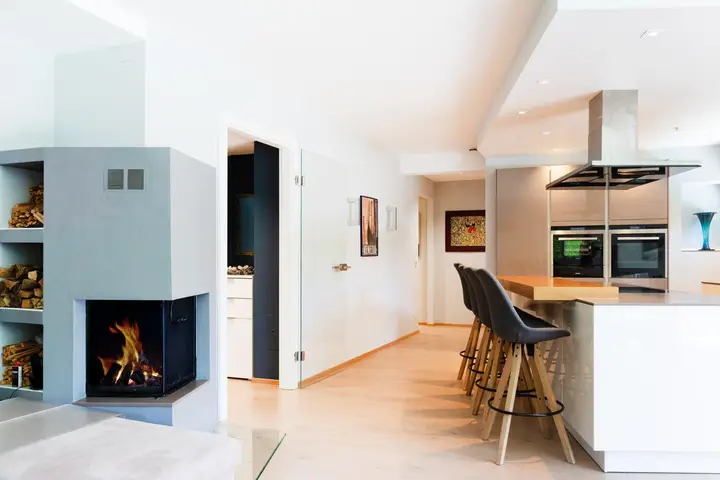 Die Ausstattung lässt keine Wünsche offen: Fußbodenheizung, integrierte Klimakanäle ohne sichtbare Geräte, ein KNX-Smart-Home-System von Gira, LAN-Verkabelung, dimmbare LED-Beleuchtung von Lumitech sowie eine hochwertige Siematic-Küche mit Dampfgarer, Tellerwärmer und weiteren Premium-Geräten.