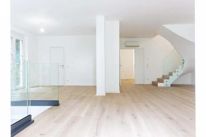 Die Wohnung erstreckt sich über drei Ebenen und überzeugt durch einen klar strukturierten Grundriss. Im Erdgeschoss bildet das großzügige, lichtdurchflutete Wohnzimmer mit seinen weitläufigen Glasflächen den Mittelpunkt. Von hier aus gelangt man über wenige Stufen direkt in den rund 195 m² großen Eigengarten, der die Wohnung umschließt und ein hohes Maß an Privatsphäre bietet. Die angrenzende, separate Küche fügt sich harmonisch in den Wohnbereich ein. Zudem befinden sich auf dieser Ebene ein Zimmer mit eigenem Badezimmer (Dusche), das flexibel als Büro, Gäste- oder Kinderzimmer genutzt werden kann, ein Gäste-WC, ein Abstellraum sowie ein einladender Eingangsbereich.