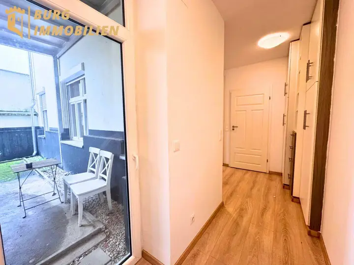 Vom zentralen Vorraum aus sind sowohl das moderne Badezimmer mit Dusche und WC als auch der Wohn-Essbereich begehbar. Von hier gelangt man in das ruhige Kabinett (ideal als Schlafzimmer) sowie auf die großzügige Hoffläche, die dem Objekt im Grundbuch zugeordnet ist.