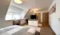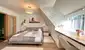 Auf dieser Etage gibt es zudem ein weiteres Badezimmer mit Dusche sowie einen großzügigen Flur mit Treppe, die ins Wohnzimmer hinunterführt.