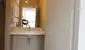 Das Bad ist mit einer großen barrierefreien Dusche, einem Waschbecken, Spiegel und einem Handtuchtrockner ausgestattet.