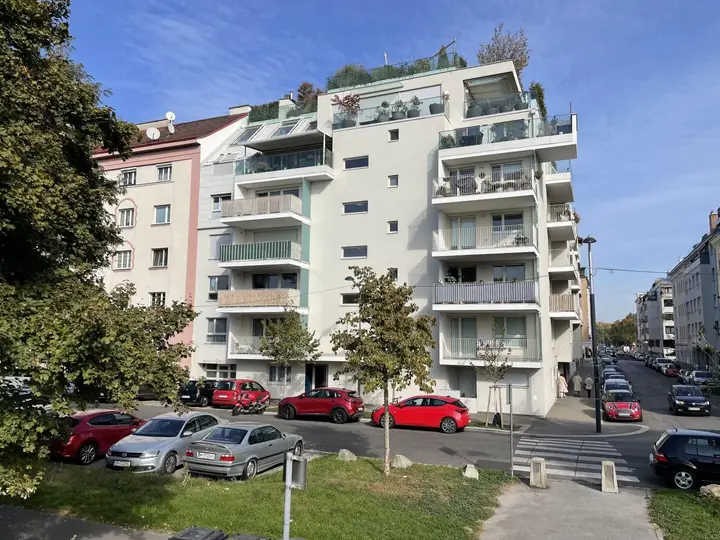 Mit Blick zum Kaisermühlendamm gelangt ab 15. November 2025 eine besonders schöne und moderne Wohnung (Wohnraum und Schlafzimmer mit großem Balkon) in einem Neubau, unweit der U1 / Kaisermühlen VIC, zur Vermietung.