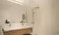 Highlight im modernen Bad ist das große Fenster, weitere Ausstattungsdetails sind Walk-in-Dusche und Doppelwaschbecken. Die separate Toilette bietet ein Handwaschbecken.