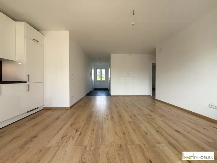 Nach Eintritt in die Wohnung gelangen Sie in ein ca. 6,50 m² großes Vorzimmer mit ausreichend Platz für Ihre Garderobe. Die knapp 24 m² große Wohnküche wird mit einer EWE Einbauküche inkl. Geräte ausgestattet. Beide Schlafzimmer sind ca. 12 m² groß und bieten daher ausreichend Platz für ein Bett + Kleiderschrank. Getrennt werden die beiden Schlafräume auch einen ca. 1,80 m² großen Abstellraum. Selbstverständlich ist das Badezimmer dass mit einer Wanne, Waschbecken & WM - Anschluss ausgestattet ist, getrennt vom WC begehbar. Dieses verfügt natürlich auch über ein Waschbecken. Im Mietpreis inkludiert ist 1 KFZ Stellplatz.