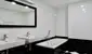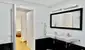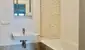 und ein Badezimmer mit Badewanne, Dusche, Doppelwaschbecken und WC.