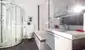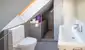 • Badezimmer mit Fenster, Dusche, Waschtisch und Toilette
