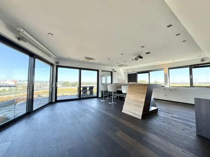 Die zur Miete angebotene Einheit umfasst einen neugebauten Trakt samt exklusiver Skylounge mit ca. 48,68 m² und direktem Terrassenzugang. Die Fläche ist durch einen eigenen Eingang vollständig separat erschlossen und bietet eine funktionale Raumaufteilung mit modernen Büroräumen, Besprechungsbereich, Küche und Sanitäreinheiten.