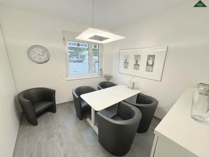 Neben den Arbeitsplätzen gibt es ein Besprechungszimmer sowie Bad und WC.