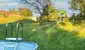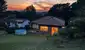 Die südseitige Terrasse mit Blick in den Garten bietet Potenzial zur individuellen Fertigstellung. Der Außenbereich umfasst außerdem eine Gartenhütte und einen Kinderspielplatz.