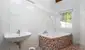 Badezimmer: Großzügiges Badezimmer mit Badewanne, modernem Waschtisch und stilvollem Fliesendesign.