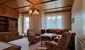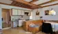 Das Obergeschoss ist über einen zentralen Vorraum erschlossen. Hier befinden sich ein Büro mit großem Fenster, ein Schlafzimmer mit Zugang zum Balkon und ein angrenzendes Wohnzimmer mit weiterer Sitzgelegenheit und ebenfalls Balkonzugang. Eine voll ausgestattete Küche mit Essbereich sowie ein Badezimmer mit Dusche und WC komplettieren die Etage.