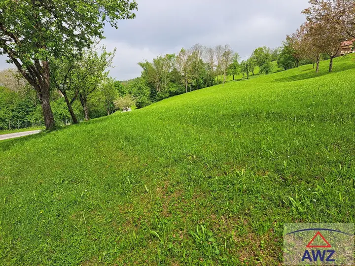Grünland mit Obstbäumen und kleinem Waldanteil.