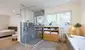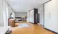 Sehr einladend ist auch die breite Holztreppe in das Obergeschoß. Im Obergeschoß angelangt, kommt man in den großzügig gestalteten Master-bedroom mit eigener Terrasse, Garderobeschränken, eigener Toilette und einer eigenen exklusiv ausgeführten Badezimmeroase, ausgestattet mit einer großen Dusche, einer Badewanne und einem Doppelwaschbecken. Auch im Master-bedroom spiegelt sich die Offenheit und Großzügigkeit wider. Große Glaselemente lassen auch diese Räume mit Tageslicht durchfluten und gestalten den Master-bedroom hell und freundlich.