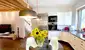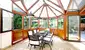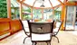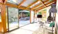 Zugang zum hellen Wintergarten mit Schwedenofen, Fußbodenheizung und Markise