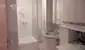 Bad mit Dusche, Waschbecken, Spiegelschrank und Waschmaschine.