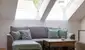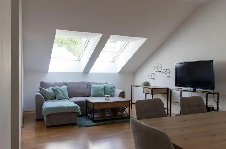 Wohnzimmer mit ausziehbarer Schlafcouch für Platz bis zu 2 Personen & Schreibtisch zum Lernen oder Arbeiten