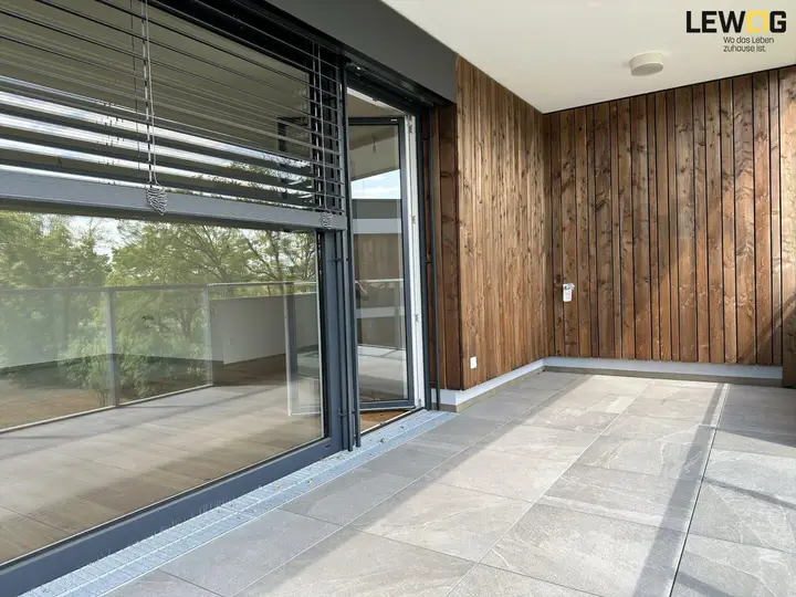 Sowohl vom lichtdurchfluteten Wohnbereich mit großer Glasfront als auch vom Schlafzimmer gelangen Sie auf den großzügigen Balkon mit hochwertigen Feinsteinzeugplatten und frostfreier Wasseranschlussarmatur.