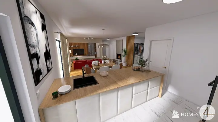 Genießen Sie gemeinsame Mahlzeiten am großzügigen Esstisch und erleben Sie unvergessliche Momente in stilvollem Ambiente. Der nahtlose Übergang vom Wohnbereich zur Küche fördert die Kommunikation und schafft eine behagliche Atmosphäre. Durch den Ausgang auf die Terrasse mitten im Raum, haben Sie eine natürliche Erweiterung vom Wohnzimmer in den Außenbereich.