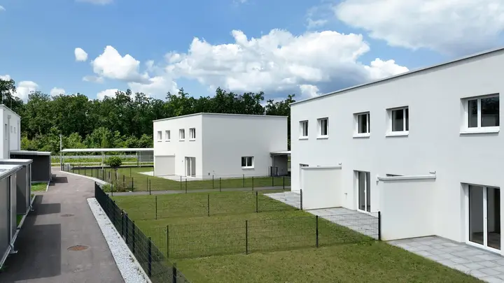 Die Wohnfläche der Doppel- bzw. Reihenhäuser beträgt ca. 106 m² und jedes Haus reicht über zwei Geschoße. Neben einer großzügigen Terrasse verfügt jede Einheit auch über einen Eigengarten.