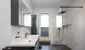 Der offen gestaltete Wohn-/Ess-/Küchenbereich bildet das Herzstück der Wohnung – großzügig, hell und mit mehreren Zugängen zur umlaufenden Terrasse. Das Schlafzimmer ist eine ruhige Rückzugsoase; das Bad bietet eine bodengleiche, begehbare Dusche, das WC ist separat.