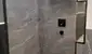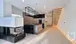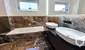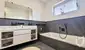 Das geräumige Badezimmer mit Doppelwaschbecken, großer Dusche und Badewanne harmoniert perfekt im Einklang mit den verwendeten Materialien.