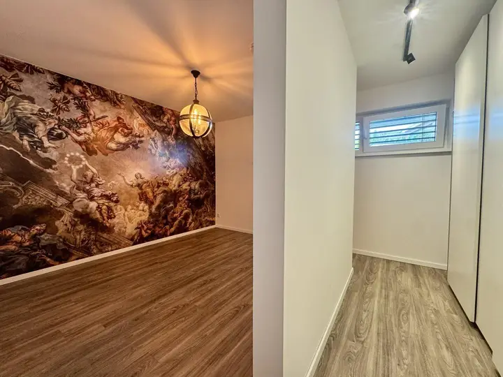 Der Architekt hat hier keine Fehler gemacht. Die Raumaufteilung ist durchdacht bis ins letzte Detail. Zwei Schlafzimmer, die keine Fragen offen lassen, treffen auf einen offenen Wohn-Essbereich. Das Highlight: Eine maßgefertigte Tischlerküche. Keine Hobby-Lösung, mein Herr. Hier wurde investiert. Badezimmer? Wanne und Dusche. Separiertes WC. Dazu ein praktischer Abstellraum. Top-Ausstattung ist hier keine Floskel, sondern eine Zusage. Fußbodenheizung (über Luftwärmepumpe – niedrige Betriebskosten!) unter edlem Parkett. Außenliegender Sonnenschutz, der die Hitze dort lässt, wo sie hingehört. Der Eingangsbereich? Ebenfalls vom Tischler, ein Empfang, der schon beim ersten Schritt signalisiert: Hier sind Sie angekommen.
