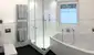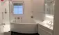 Über einen kleinen Flur gelangt man in das helle weiß verflieste Badezimmer, dies ist mit einer Dusche, einer großzügigen Badewanne, einem WC, und einem Waschtisch mit beleuchtetem Spiegel ausgestattet.