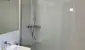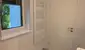Das Bad verfügt über eine Walk-in Dusche mit einer Glastrennwand, Waschbecken und einen Handtuchtrockner.